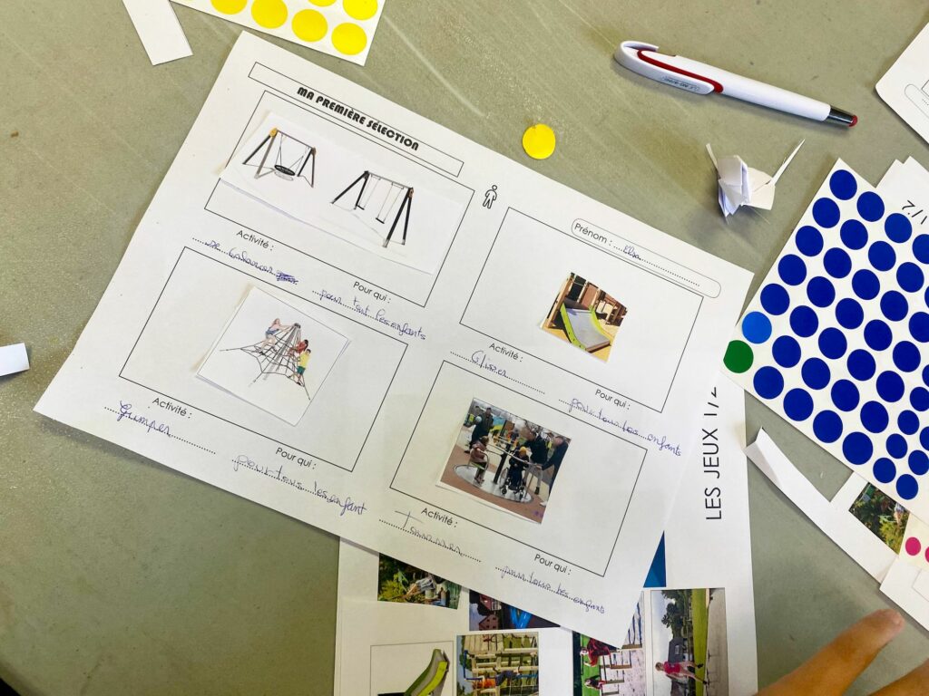 Ils ont ensuite fait dans un premier temps une sélection d’activité/jeux parmi un large choix (toboggan, jeux de grimpe, panneaux ludiques, balançoires, etc), pour ensuite se confronter en groupe et arriver à une sélection commune.