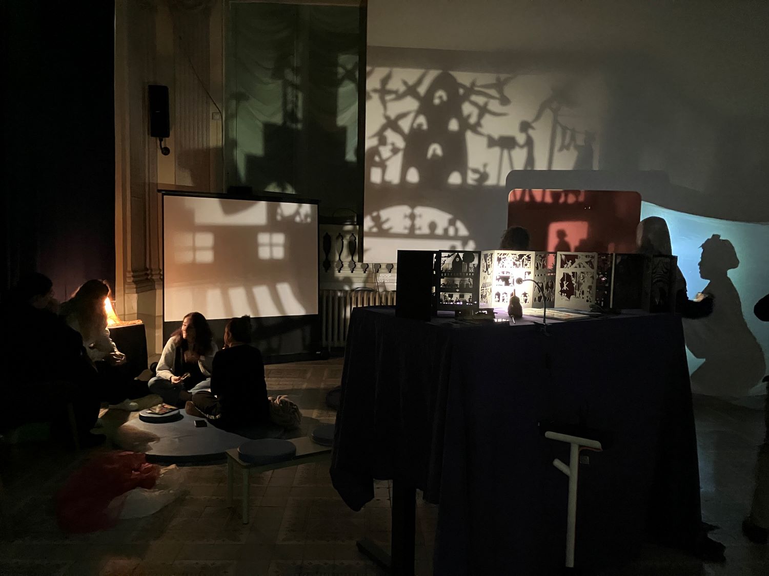 En s’appuyant sur le contexte des Nuits de la lecture, nous avons proposé aux participant.es d’aménager des espaces pour des lectures-événements autour de la thématique. Deux espaces ont été aménagés, avec deux ambiances et intentions différentes, jouant sur la lumière, le son, le mobilier, les délimitations… Les participant.es ont pu s’approprier les espaces et les remodeler pour les adapter à leurs projets.